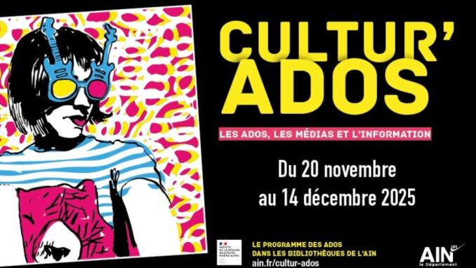 Par DALILA ZENAGUI, publié le mardi 4 novembre 2025 09:38 - Mis à jour le mardi 4 novembre 2025 09:40Du 20 novembre au 14 décembre 2025, une vingtaine de bibliothèques de l’Ain proposeront plus d’une trentaine d’événements à destination des adolescents et des collégiens de l’Ain